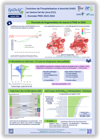 Modifié le 15/01/2026 HOSPITALISATION À DOMICILE Hospitalisation à domicile en Centre-Val de Loire Données Région Centre-Val de Loire, PMSI HAD et MCO : Poster 2015-2024 Poids : 863Ko Présentation 2015-2024 Poids : 1.37Mo Présentation 2015-2023, table ronde HAD, Institut de Formation des Cadres de Santé (IFCS), 25 septembre 2024 Poids : 1,019Ko Présentation 2014-2022, table ronde HAD, IFCS, 23 octobre 2023 Poids : 853Ko Présentation 2013-2021, table ronde HAD, IFCS, 28 octobre 2022 Poids : 1.44Mo Présentation 2012-2020, table ronde HAD, IFCS, 3 janvier 2022 Poids : 1.14Mo Rapport 2010-2019 Poids : 2.35Mo Archives 2007-2019